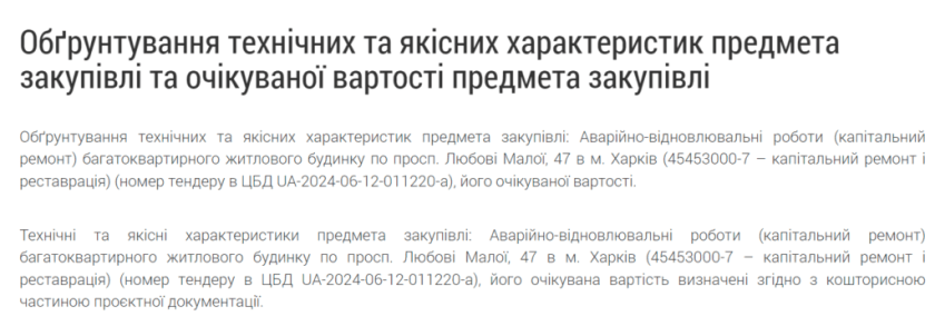 Зараз підприємство отримало підряд на відновлення будинку по проспекту Любові Малої, 47. Вартість робіт 7,49 млн грн. Під час проведення процедури тендеру ДАСУ запитувала у замовника щодо документів з розрахунку вартості робіт, у відповіді було посилання на обґрунтування без лінків на самий документ.