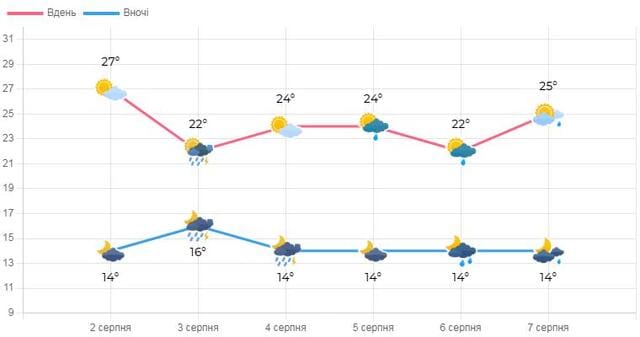 Нічні температури коливатимуться в межах 11 – 16° тепла, вдень у суботу 18 – 23° тепла, у неділю дещо підвищаться до 23 – 28° тепла.