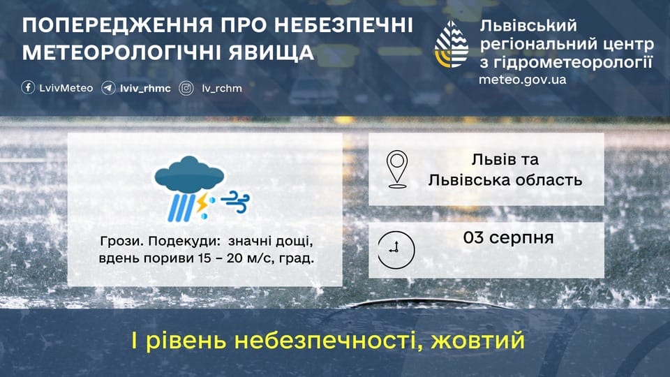 По території Львівської області: 3 серпня грози, місцями значні дощі, вдень подекуди шквали 15 – 20 м/с, град.