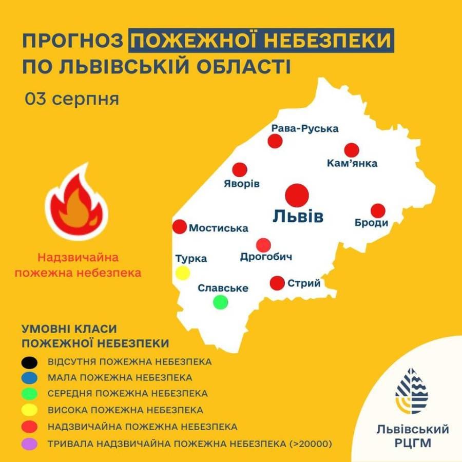 03 серпня надзвичайна (5-й клас), в горах місцями середня (3-й клас) та висока (4-й клас) пожежна небезпека.