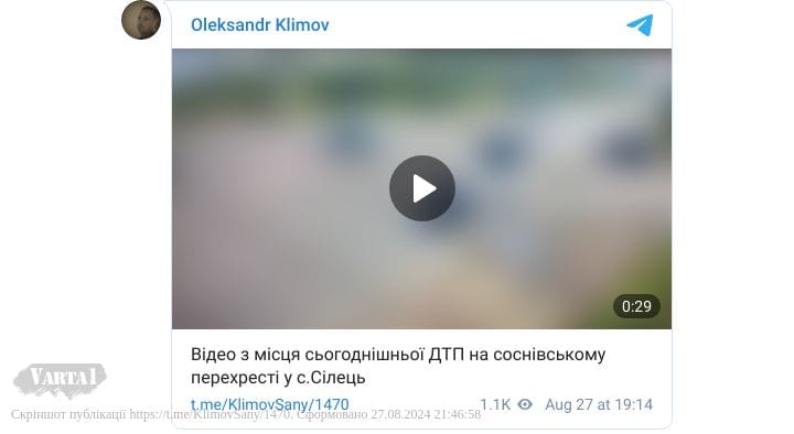 Сьогодні, 27 серпня, близько 17 год. неподалік села Бендюга Червоноградського району Львівської області сталася ДТП. Про це повідомив депутат Червоноградської районної ради, керівник ГО «Дорожній контроль Захід» Олександр Клімов.