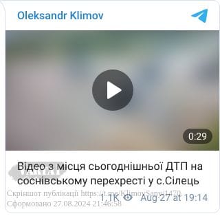 Сьогодні, 27 серпня, близько 17 год. неподалік села Бендюга Червоноградського району Львівської області сталася ДТП. Про це повідомив депутат Червоноградської районної ради, керівник ГО «Дорожній контроль Захід» Олександр Клімов.