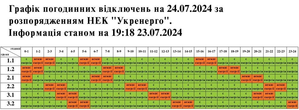 З 8:00 до 20:00 і з 22:00 до 24:00 діятиме одна черга відключень. В інші години обленерго будуть застосовувати дві черги одночасно.