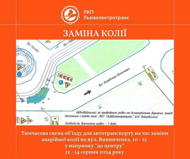 12-14 серпня, на вул. Винниченка у центрі Львова комунальники проводитимуть заміну аварійної ділянки трамвайної колії. На час ремонтних робіт для руху маршруток та приватного транспорту відкриють частину вул. Винниченка біля Львівської ОВА та обласної ради.
