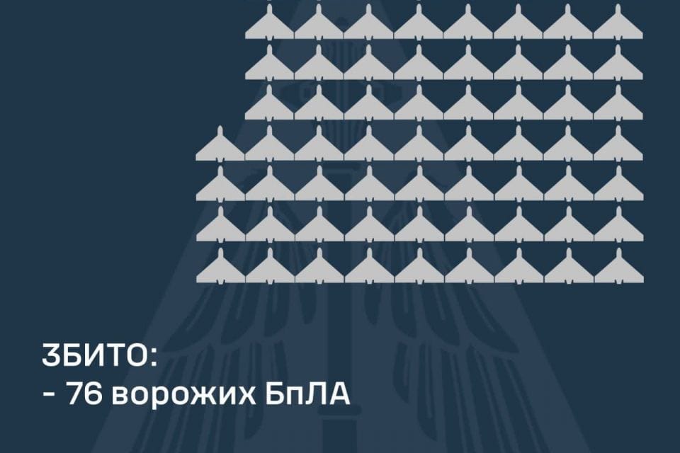 Станом на 09.00 протиповітряною обороною збито 76 ворожих безпілотників у Київській, Черкаській, Кіровоградській, Чернігівській, Сумській, Харківській, Полтавській, Житомирській, Хмельницькій, Вінницькій, Чернівецькій, Тернопільській, Рівненській, Запорізькій, Дніпропетровській, Одеській та Миколаївській областях.