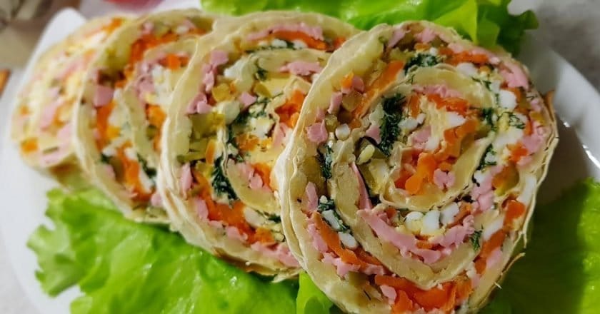 Приготування: Відварити яйце, картоплю і моркву до готовності. Натріть всі інгредієнти на великій терці. Змасти лист лаваша майонезом та вершковим сиром. Виклади решту інгредієнтів, зверни тугий рулет і затягни його в плівку. Відправ на годину в холодильник і наріж перед подачею. …