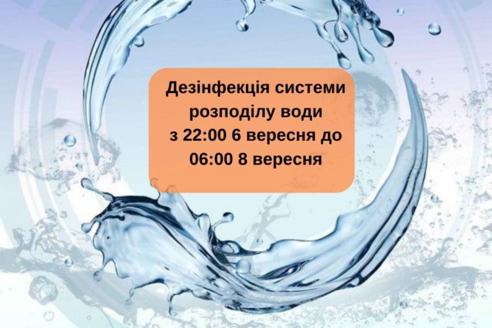 З 22:00 6 вересня до 06:00 8 вересня виконуватимуться заходи з дезінфекції системи розподілу води.