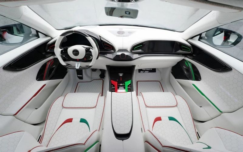 Салон Ferrari Purosangue оздобили білою шкірою та карбоном, а також додали декор у вигляді італійського прапора.
