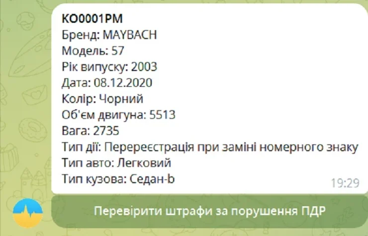На кузові Maybach 57 можна помітити наліпки CD, якими позначають дипломатичні автомобілі, проте седан має звичайні номери Закарпатської області. Фокус перевірив номери у базі даних OpenDataBot: там вказано, що автомобіль отримав їх під час перереєстрації в 2020 році.