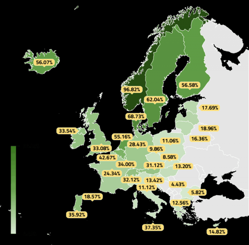 Балтійські країни та Ісландія показали приріст від 30% до понад 100%. Високі відсотки пояснюються низькою стартовою базою — знайома ситуація для ринків, де стимули почали працювати нещодавно.