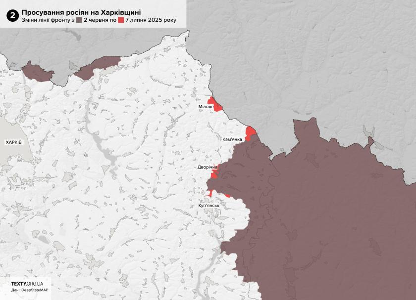 Останній тиждень майже щодня аналітики DeepState повідомляють про просування ворога у Харківській області. Судячи з повідомлень аналітиків з 10 липня, ворог мав успіхи одночасно на кількох напрямках: у районі Вовчанська і населених пунктів неподалік, на новому відтинку, де росіянам вдалося прорвати кордон і зайняти село Мілове, на плацдармі поблизу Дворічної, на північ від Куп’янська та південніше, у напрямку Борової.