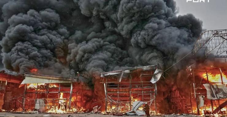 Внаслідок обстрілу загорівся дитячий майданчик “Барабашово”. Згоріли та пошкоджені кількасот торгових павільйонів, рятувальники продовжують гасити вогонь.