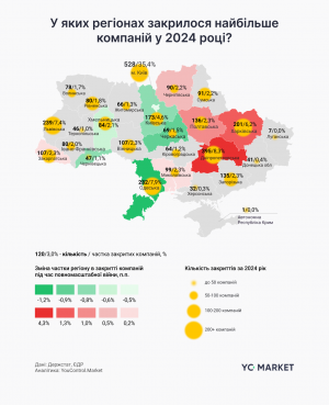 Загалом у 2024 році в Україні зупинили діяльність майже 3,3 тис. компаній і це на 12,7% менше ніж у 2023 році (3,7 тис.). Найбільше закриттів у Києві — 528, Дніпропетровській області — 395, Одеській області — 282. Інтенсивність ліквідації підприємств у 2024 році зросла найбільше в Дніпропетровській, Харківській та Полтавській областях.