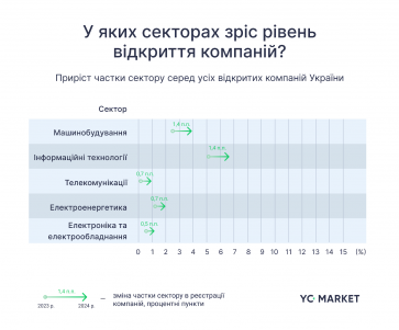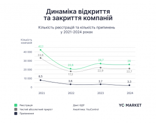 За даними YC.Market у 2024 році в Україні відкрили трохи більше ніж 26 тисяч нових компаній, що на 2,7% менше відносно 2023 року. Кількість закритих компаній протягом 2024 (3,3 тис.) року скоротилася на 12,7% відносно 2023 (3,7 тис.) року.