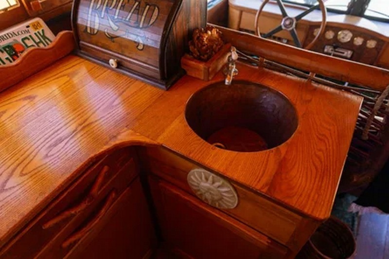 Примітно, що навіть раковина виготовлена з дерева. Водійське місце відділене від жилого модуля оригінальним плетеним “тином”.
